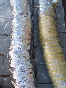 If you peek in your attic and see anything looking like this, NOT SHINY SILVER FOIL; that old duct with the stripes or crosshatch showing is not serviceable, Call me, you